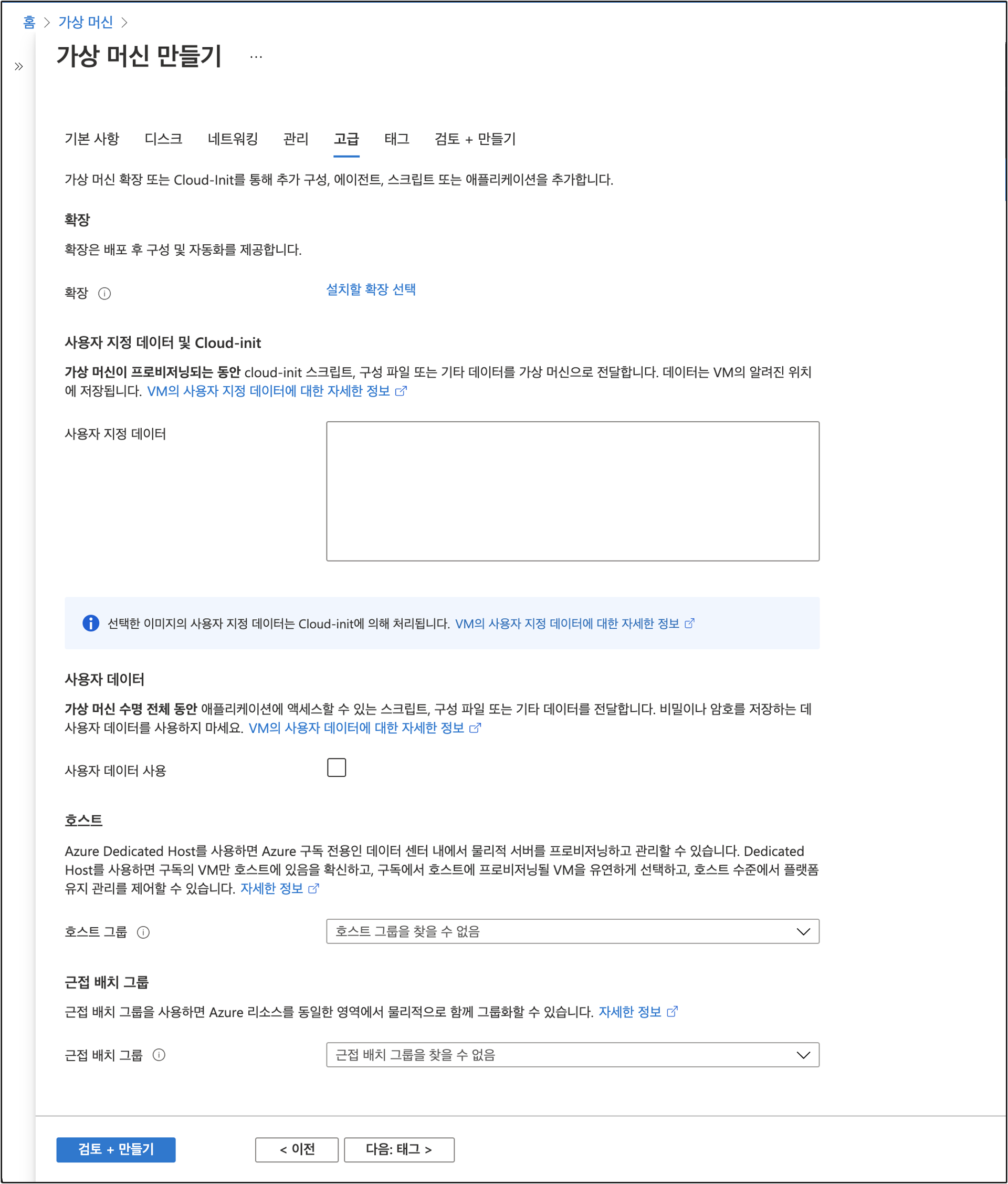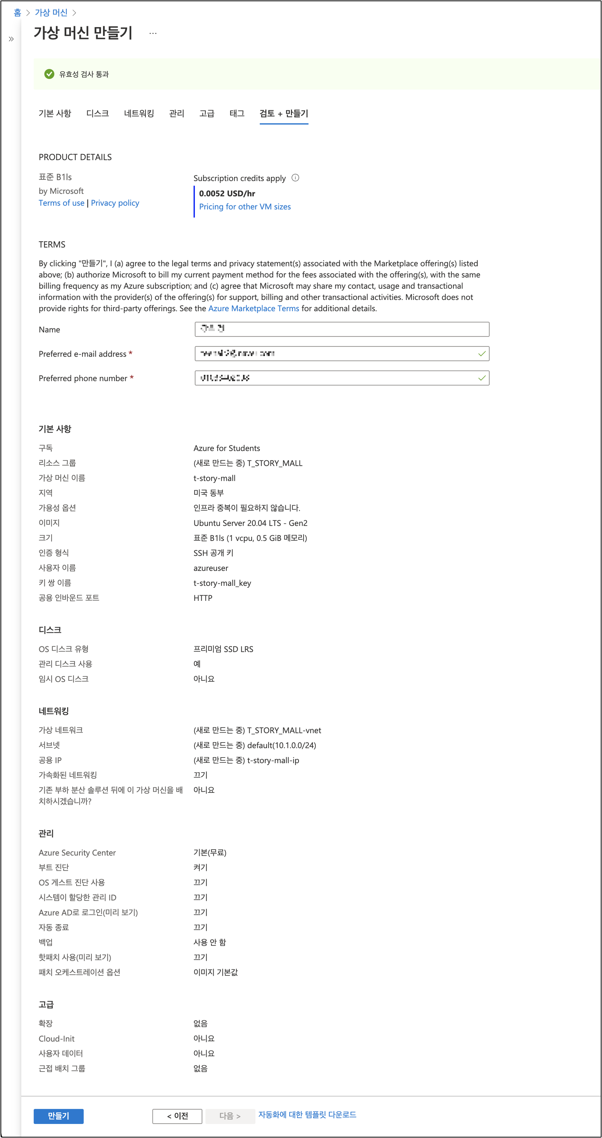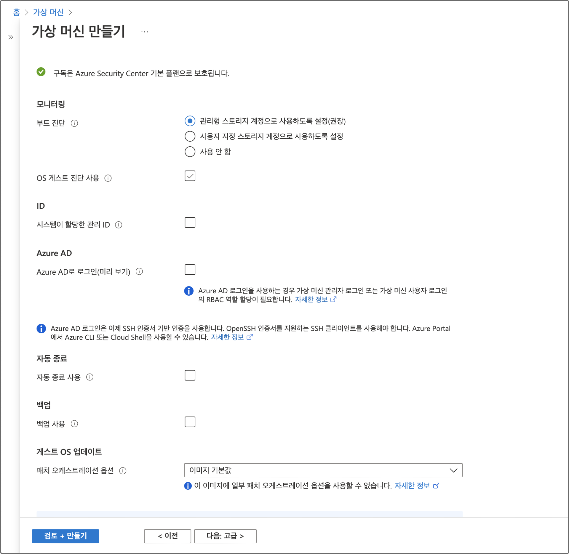 3.6 '검토 + 만들기'를 설정하여 최종적으로 가상머신을 만들어줍니다.