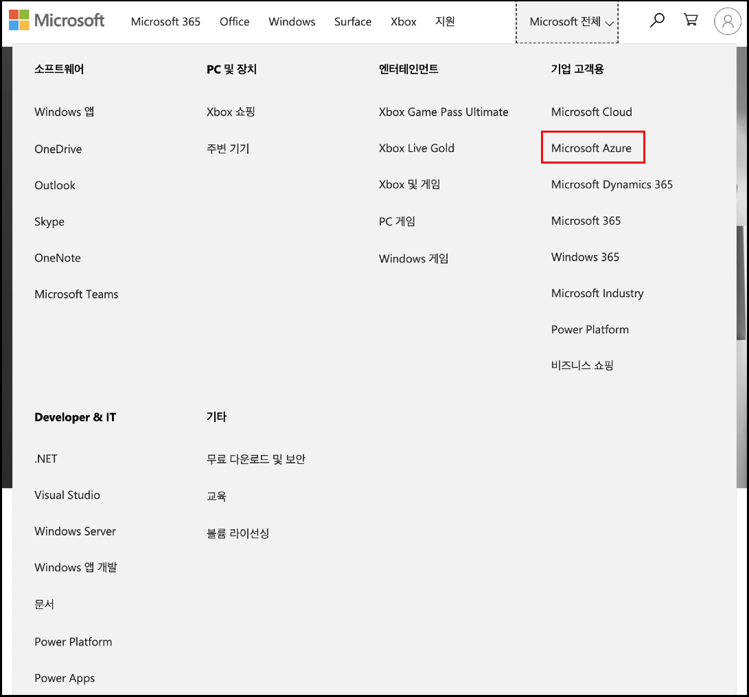 2. 가입이 완료 되셨다면 오른쪽 Microsoft 전체 > 기업 고객용 > Microsoft Azure을 선택해줍니다.
