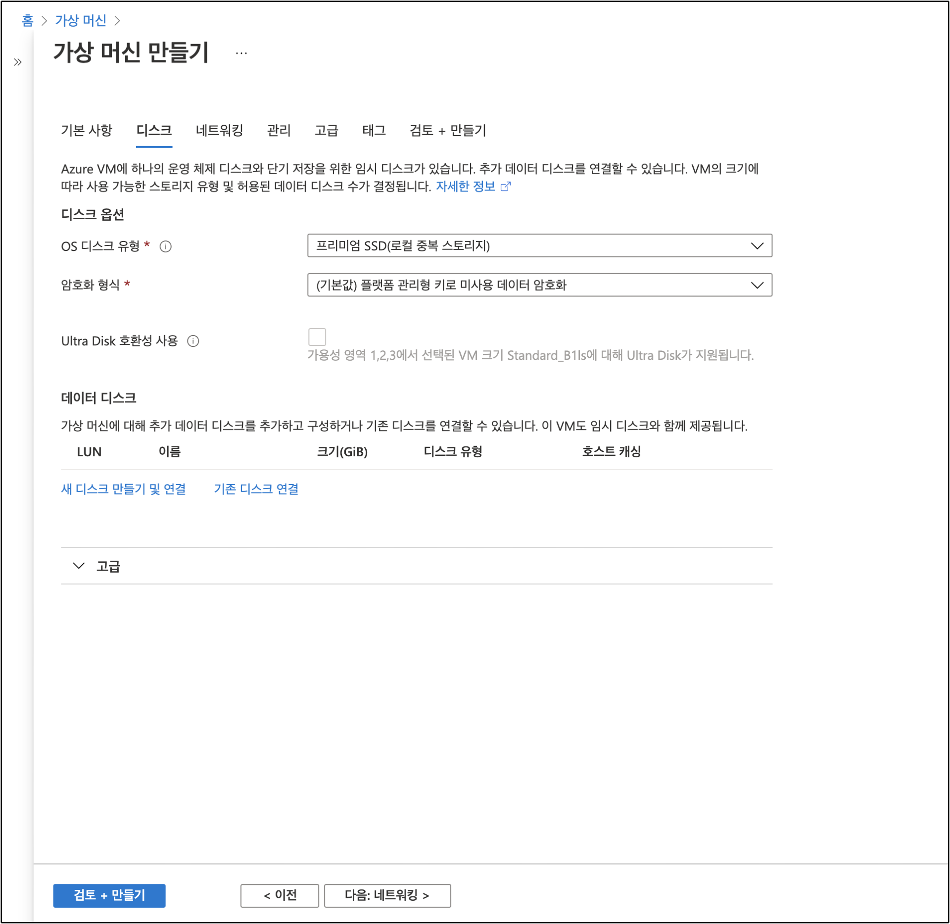 - OS 디스크 유형 : 내가 사용할 OS의 디스크를 설정해 줍니다.. 옵션은 기본으로 설정 하였습니다.