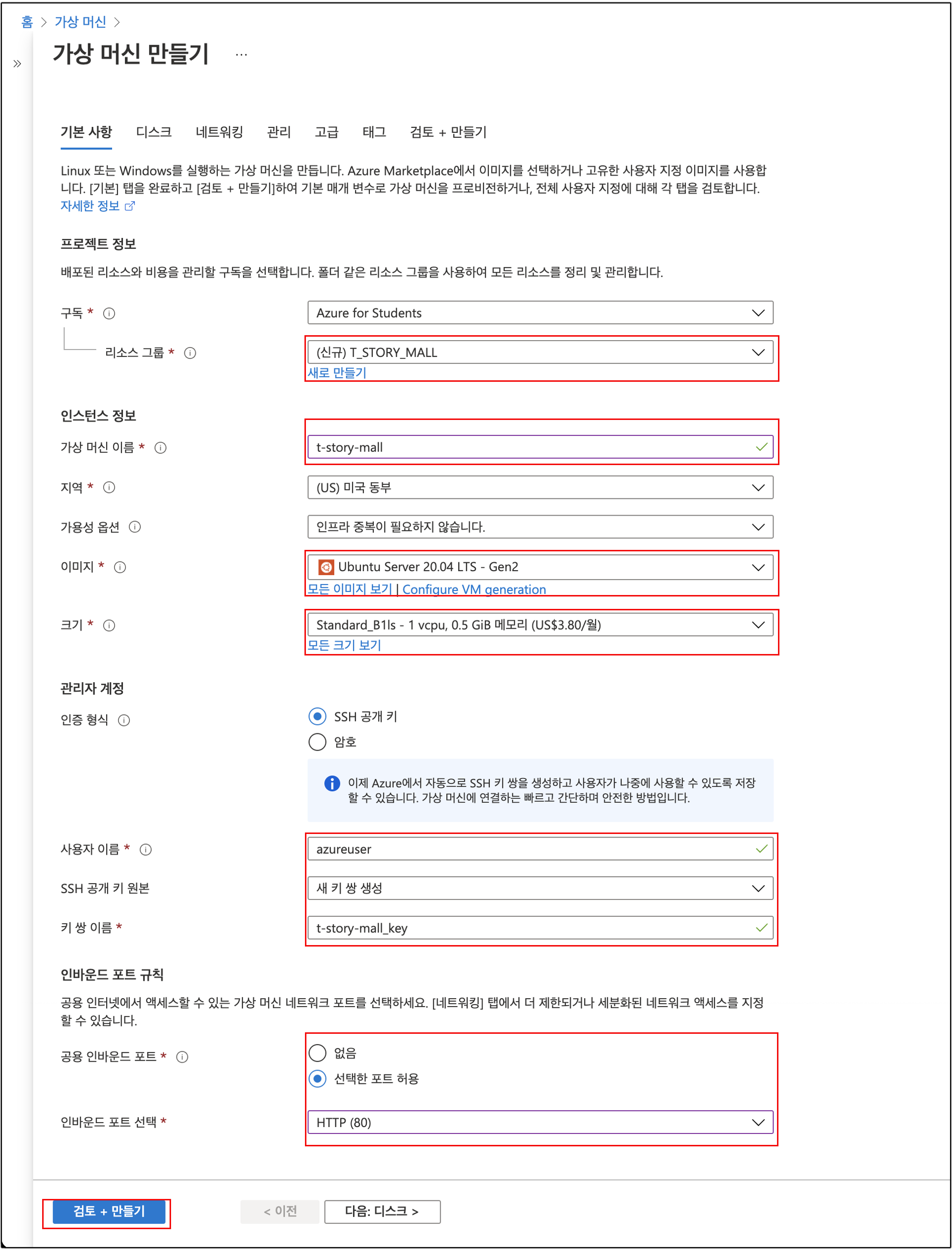 - 키 쌍 이름 다운 받은 키의 이름을 지정해 줍니다. 't-story-mall_key' 기본으로 머신이름과 맞췄습니다.