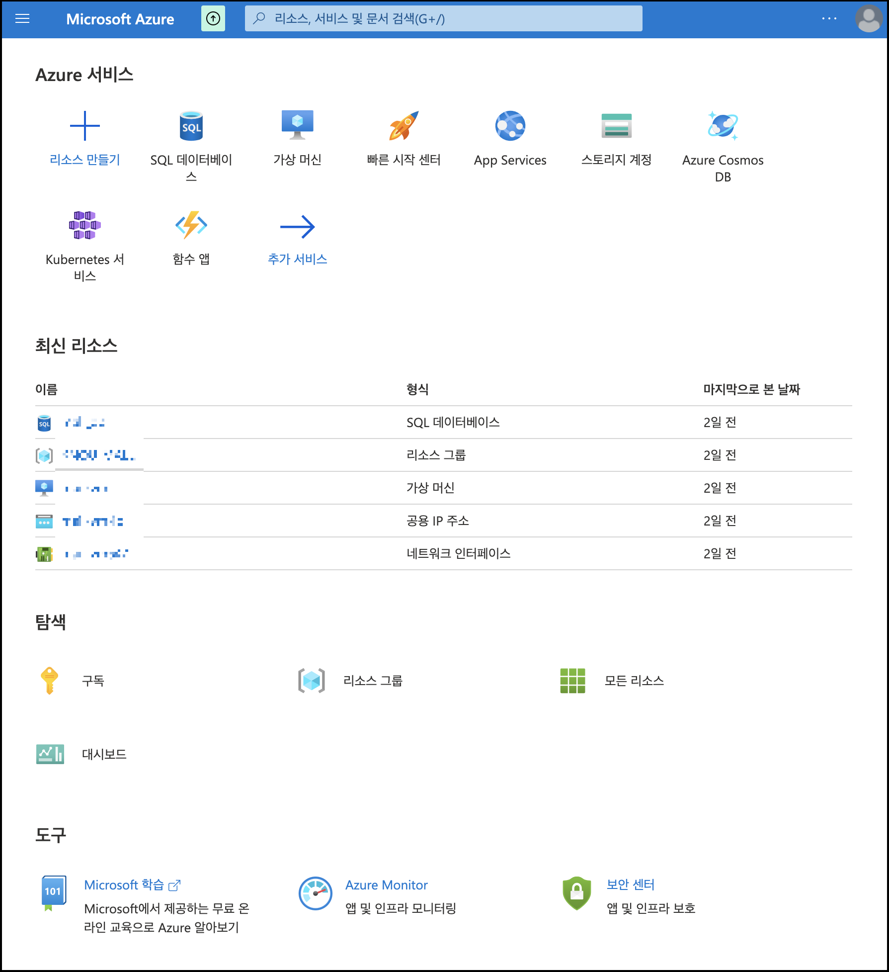 이제 Azure의 메인화면으로 진입 하였습니다.