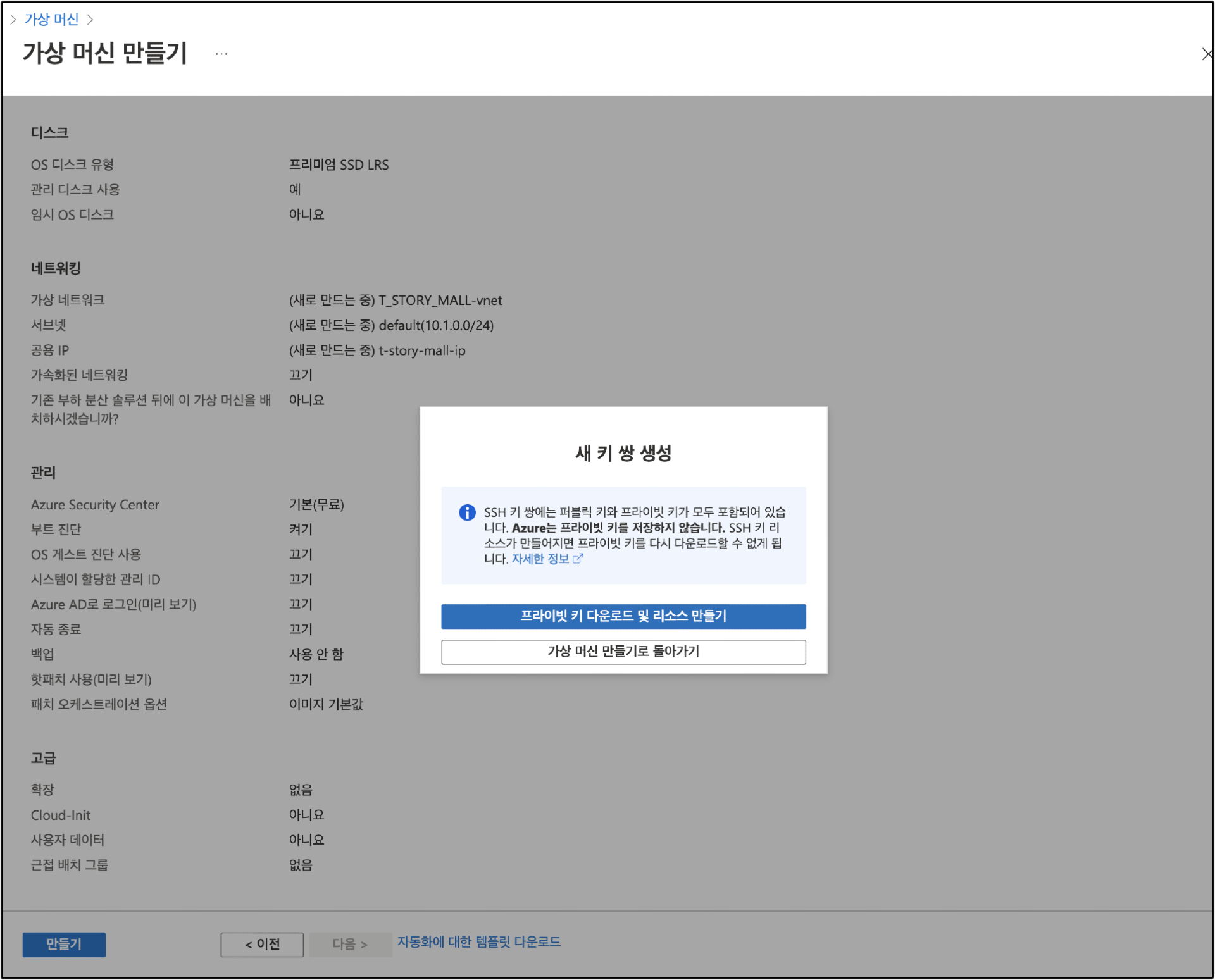 - 키 쌍 이름 다운 받은 키의 이름을 지정해 줍니다. 't-story-mall_key' 기본으로 머신이름과 맞췄습니다.