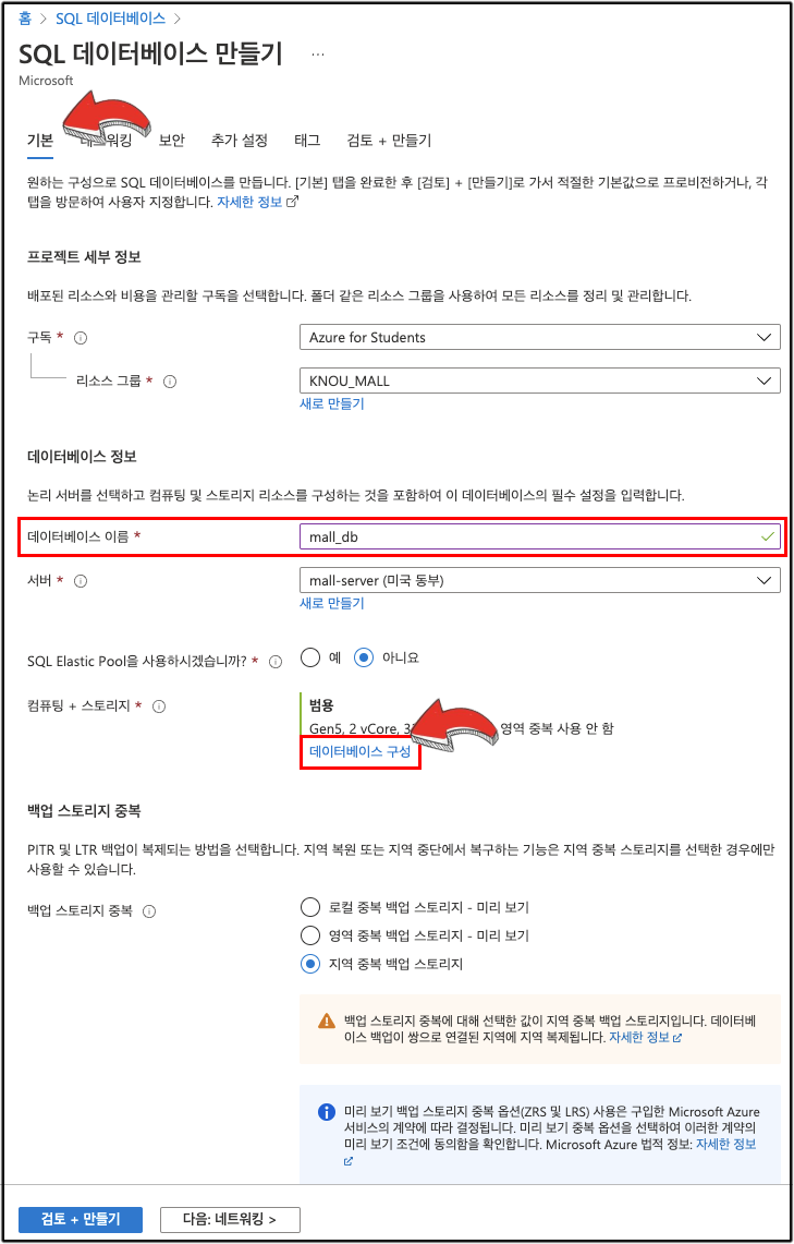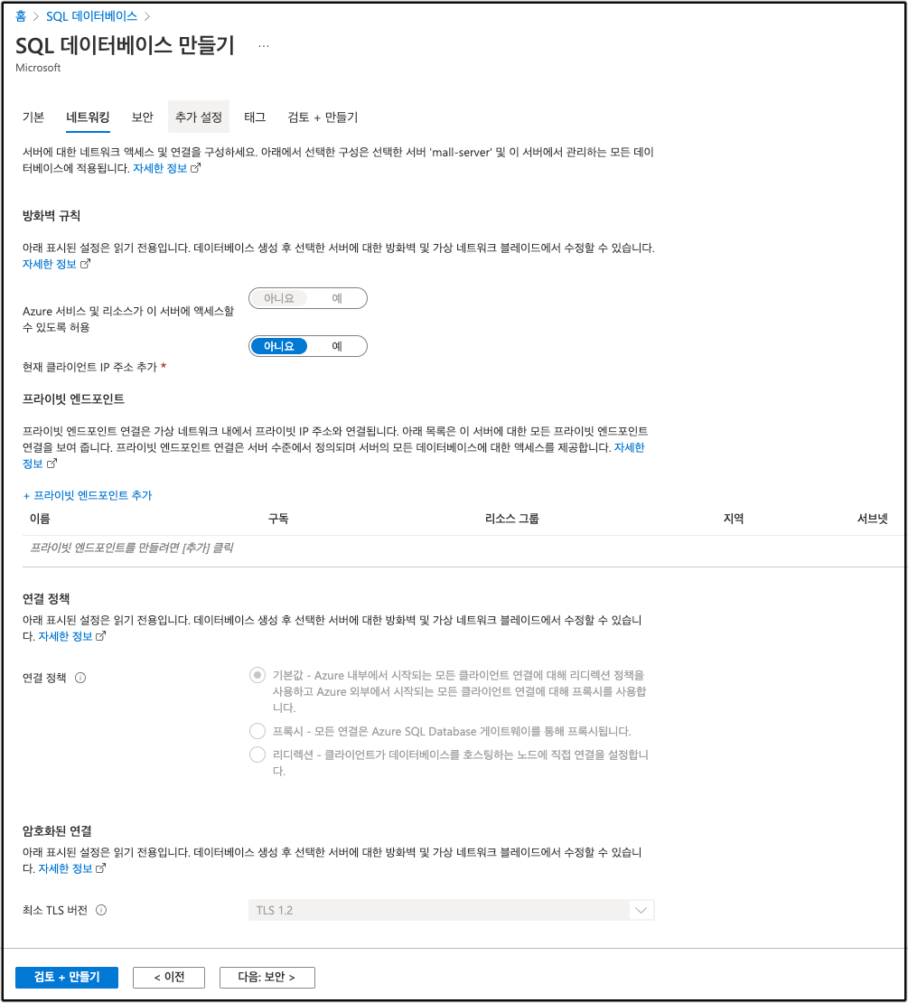 3. 네트워킹 설정은 SQL 설정이 끝난후 접속 IP에 대해서 추가하도록 하겠습니다.