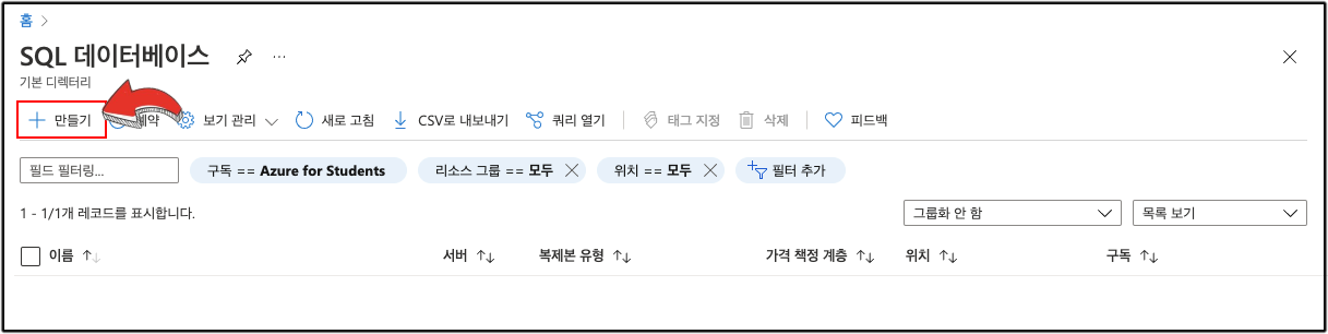 2. '+ 만들기'를 선택해서 SQL 데이터 베이스를 새롭게 만들어 보겠습니다.