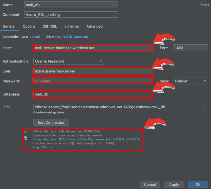 그런 다음 DataGrip에 접속하여 Azure SQL Database를 생성해 줍니다.