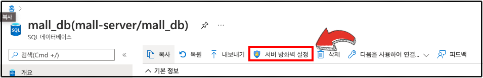 아이피가 확인 되었다면, 생성된 SQL의 상세화면으로 들어와 서버 방화벽 설정을 클릭해줍니다.