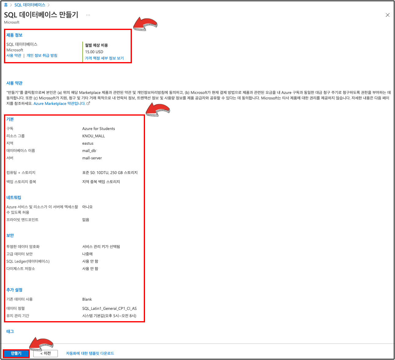만들기 버튼을 누르기 전 제품의 정보와 기본 구성, 네트워킹, 보안, 추가 설정 등을 꼼꼼히 살피고 '만들기' 버튼을 클릭해 줍니다.