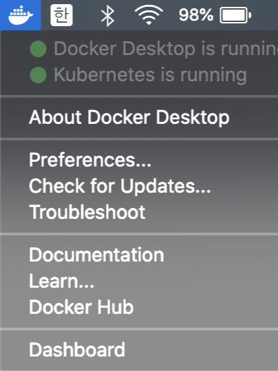 설치가 완료되면 오른쪽 상단에 Dcoker 로고가 나타납니다.