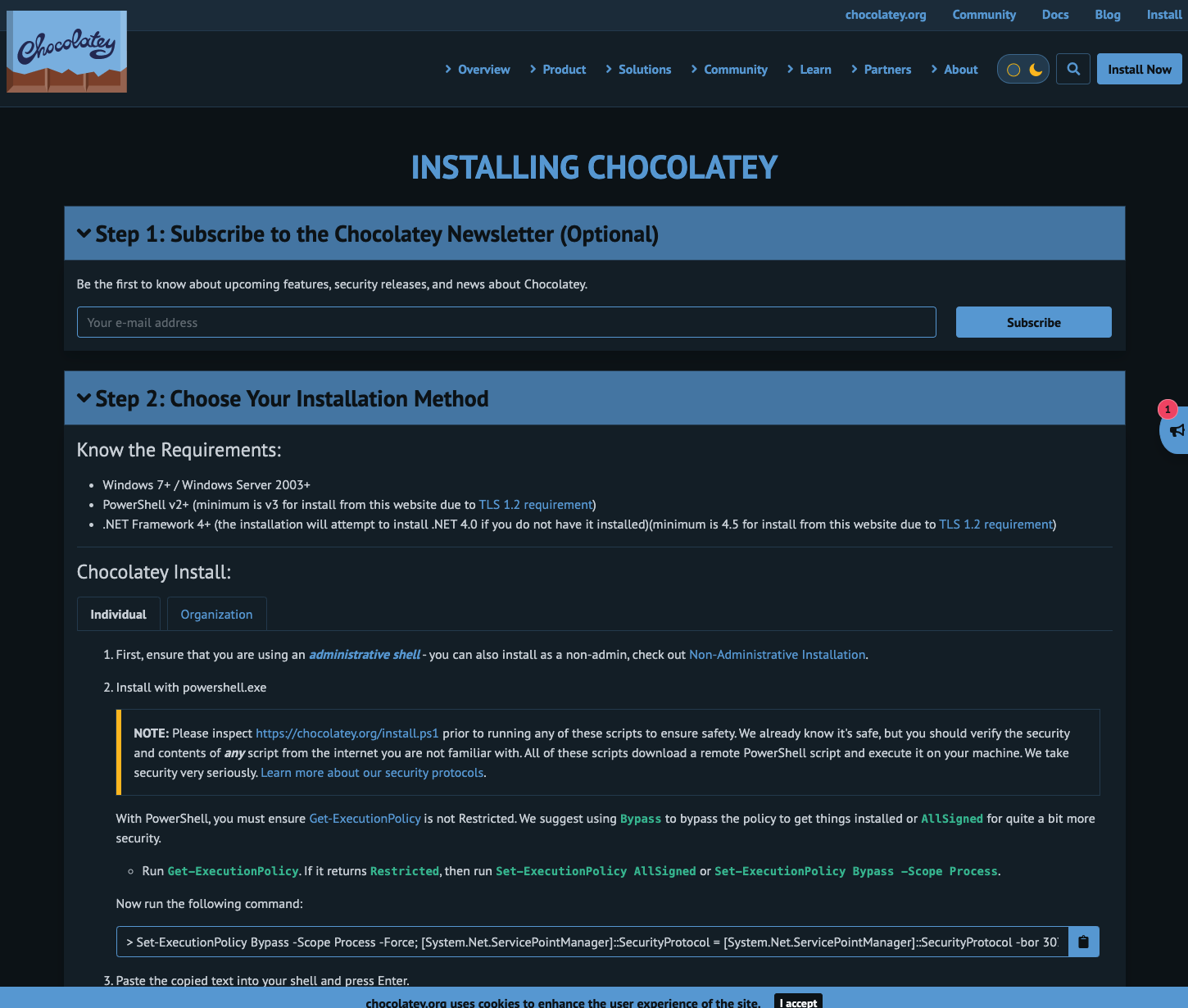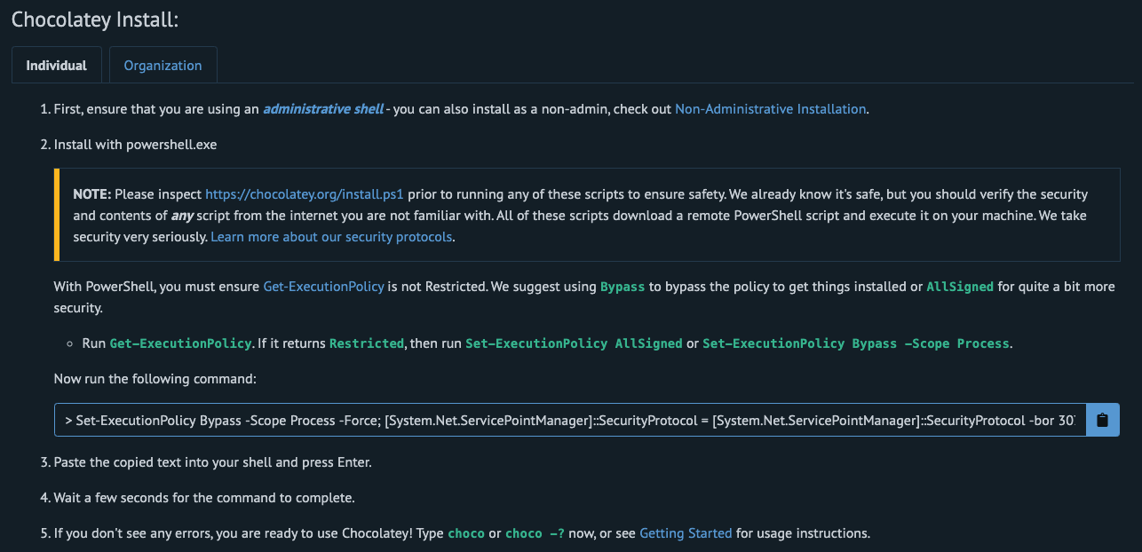 4. 이제 아래로 내려오게 되면 Chocolatey Install : 을 확인할 수 있습니다.