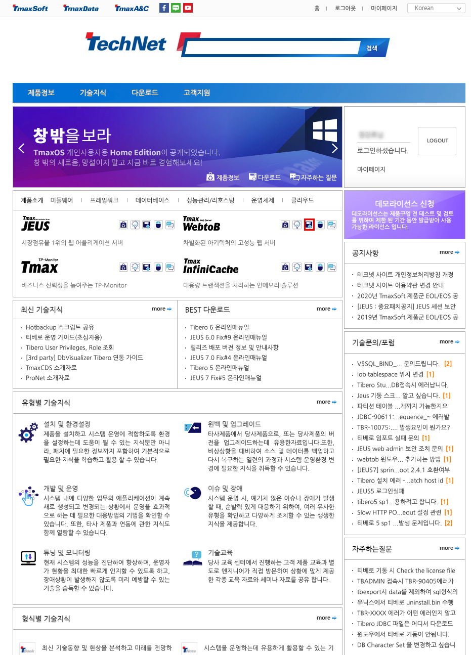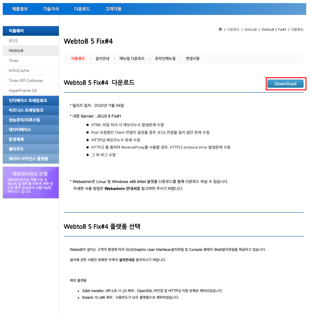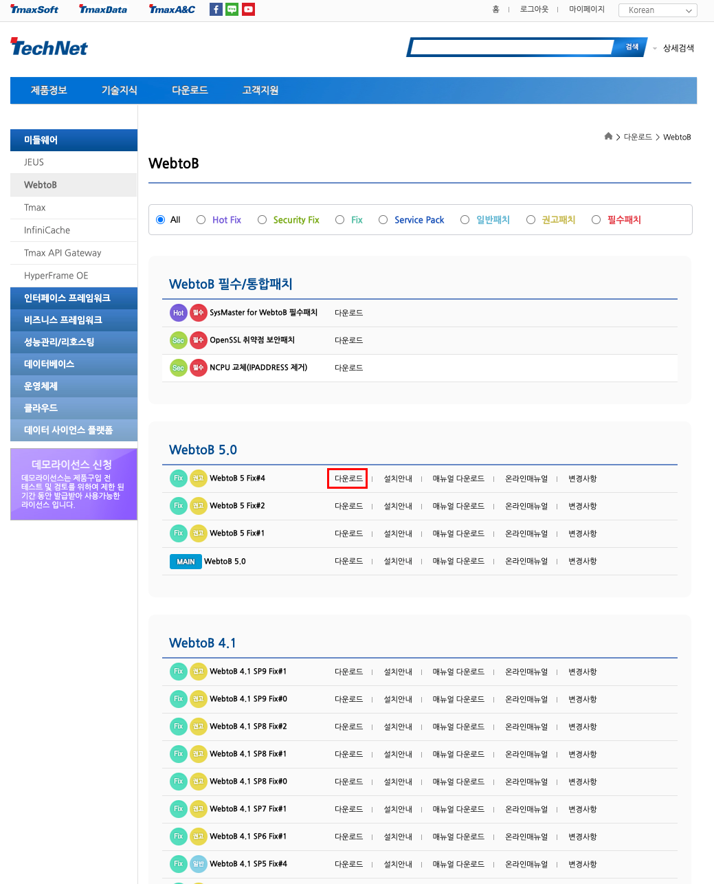 로그인을 한 후 WebtoB 다운로드를 클릭 해줍니다.